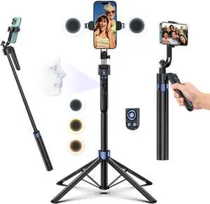 86 Inch 360° Rotation Extendable Selfie Stick & Tripod Stand with Dual Bluetooth Wireless Remote and 2 LED Fill Light and Phone Holder Compatible with iPhone Android Cameras Gopro