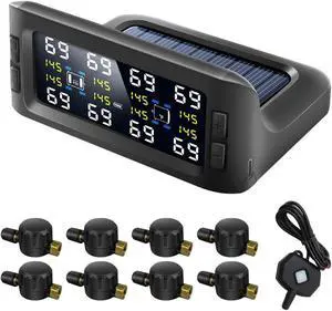 Tire Pressure Monitoring System Solar TPMS w/8 Flow Thru Sensors & Signal Repeater - Long Range Transmission for RV/Truck/Trailer/Camper, 7 Alert Modes Real Time Monitoring (0-199 PSI)