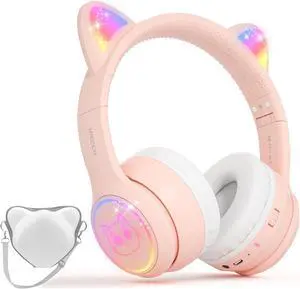 IFECCO Wireless Kids Headphones with Microphone,Foldable Cute Light Up Cat Ear Children Girls Bluetooth Headphones with Case for School Gifts Travel