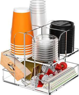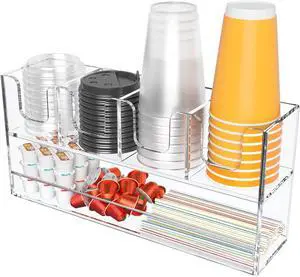 2-Tier Coffee Station Organizer for Countertop, 5 Compartments Clear Acrylic Cup and Lid Holder Tea Condiment Storage Upright Coffee Bar Organizer Pod Dispenser for Office Breakroom Home Kitchen