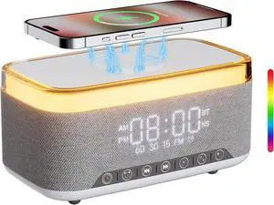 Bluetooth Speaker Alarm Clock with 10w Fast Wireless Charger for iPhone Samsung, 10W Stereo Bluetooth Speaker, 12-Color Night Light, White Noise Machine Digital Clock with FM Radio for Bedroom