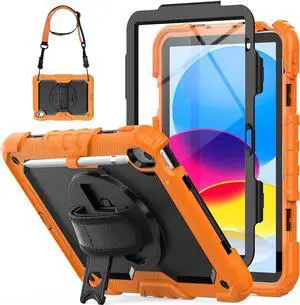 JAENFONG Case for iPad 10th Generation 10.9 inch with Pencil Holder, Screen Protector, Rotating Hand Strap Stand, Heavy Duty Protective for iPad 10 Case A2696 / A2757 / A2777, Orange