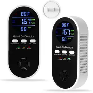 2 Pack 5-in-1 Natual Gas Detector&Carbon Monoxide Alarm,AC-Plug-in Explosive Gas&CO Detector with Adjustable Volume&Brightness,Battery Backup,Temperature(°F)&Humidity Sensor for Home,RV,Apartment