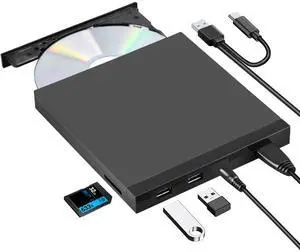 5 in 1 External CD/DVD Drive with SD Card Slot & USB 3.0 Ports, USB-C Optical Disk Reader Writer CD Burner DVD Player for Windows 11/10 Laptop, Mac MacBook, Linux PC Desktop Computer