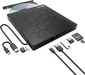 Hitoor [7 in 1] External DVD Driver, USB 3.0 & USB C Portable CD/DVD +/-RW Drive/DVD Player with SD Card Reader 4 USB A Ports, CD ROM Burner Compatible with Laptop Desktop PC Windows Linux MacOS