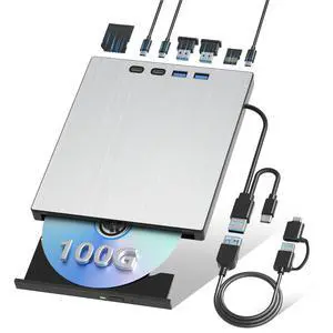 AUTYUE 6 in 1 Multi-Function External CD/DVD Drive with 3 USB A, 1 USB C & SD Card Reader, Portable DVD Player Burning Dual Interface USB-C/USB 3.0 for Laptop, Desktop, with Windows 7/8/10/11 MacOS