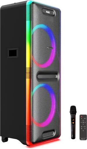 IQ Sound IQ-8315DJBT 2 X15" Bluetooth Speaker System, 120W RMS, TWS Stereo Pairing, LED Light Show, 2 Mic Inputs w/ Echo/Reverb, USB/SD/AUX, FM, Wheels, Remote + Wireless Mic, 5400mAh Battery