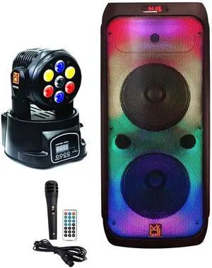MR DJ USA FLAME3200 8" X 2 Rechargeable Portable Bluetooth Karaoke Speaker with Party Flame Lights Microphone TWS USB FM Radio + 7-LED Moving Head DJ Light