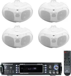 Rockville RPA60BT V2 Bundle: 1000W 2-Channel USB Bluetooth DJ/Pro/Karaoke Amplifier Mixer, (4) D4-16 White Dual 4 in 16 Ohm 200W Peak/50W RMS Swivel Outdoor Home Patio Speakers, 5-Items