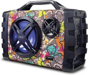 NEM Mobi7e Portable Wireless Bluetooth High Performance Stereo Speaker Extra Bass, USB Recording, Rechargeable Battery, AUX and TF Card Input, FM Radio, MP3, Mic and Guitar Input, LED Light (Graffiti)