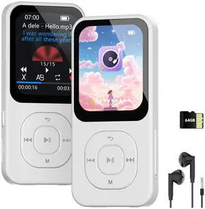 Bluetooth MP3 Player 64GB, Mini MP3 Music Players with Speaker, Supports Alarm Clock, FM Radio, Recording Function, Up to 128GB Memory Storage Extension, Earphones Included