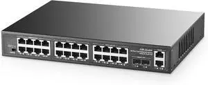 24 Port Full Gigabit PoE+ Switch, 2 Gigabit Network Uplink, 400W, Unmanaged, Fanless Silent Operation, 802.3af/at, 19''Rackmount, Qos, Suitable for POE Camera, AP, PC