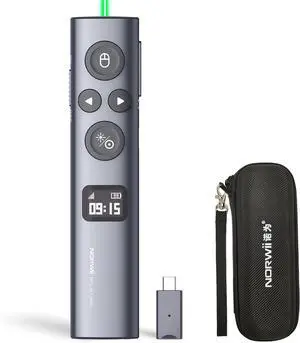 Norwii N95s BLE Presentation Clicker with Digital Pointer for PowerPoint Presentation on TV Screen and Projection Screen, Wireless Presenter Remote with Countdown Timer (Green Light-USB-AC)
