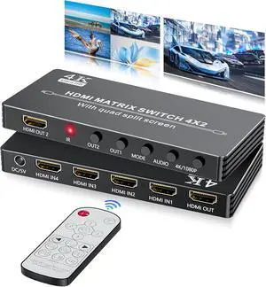 HDMI Multiviewer 4 in 2 Out, BolAAzuL Quad Multi HDMI-Viewer 4x2 Seamless Switching, 4K, 9 Viewing Mode, IR Control, for TV, Gaming Console, Projector