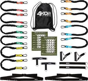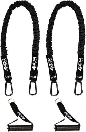 4KOR Deluxe Shoulder and Full Body Cross Anchored Resistance Cord System with Interchangeable Handles, Foot Straps, and Workout Guide. Exercise Bands with Nylon Sleeves, Anchors, and Carry Bag
