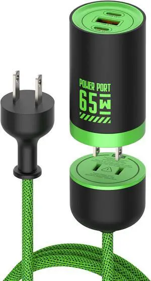 65W GaN Fast Wall Charger Block with 2 USB-C & 1 USB-A Ports, 5ft Nylon Extension Adapter High-Speed Charging for iPhone, iPad, MacBook, Galaxy, and More Devices (Cyber Green)