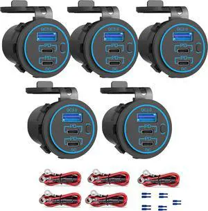 [5 Pack] 12V USB C Outlet, Two USB-C PD 20W Power Socket and 18W QC3.0 Socket Waterproof Power Outlet 12V/24V with Power Switch for Car Golf Cart Boat Marine Bus Truck RV Marine Motorcycle etc.