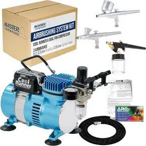 Master Airbrush Cool Runner II Dual Fan Airbrushing System Kit - Air Brush Kit with Air Compressor & 3 Airbrushes, 0.2, 0.3 mm Gravity & 0.8 mm Siphon Feed, Holder & Learning Guide Manual