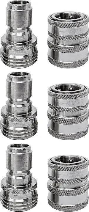 Garden Hose Adapter 6 Piece 3/4 Quick Connect Fittings Kit, Stainless Steel High Pressure Couplings and Connectors for Pressure Washers and Car Detailing, 3x3