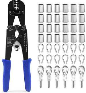 2-in-1 Wire Rope Crimping and Cutting Tool, for 1/16-Inch to 1/8-Inch Cables, with 100pcs Aluminum Loop Sleeves and 50pcs M3 Thimbles - Comprehensive Rigging Solution