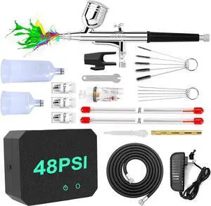 Airbrush Kit with Compressor - 48PSI High Pressure, Non-Clogging Air Brush Set, 6000 mAh Extra Long Standby, Ideal for Painting, Modeling, Cake Decorating, Pastry, Makeup and Nail Art