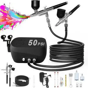 Airbrush Kit, 50 PSI Air brush Gun & Air Compressor with Dual-Airflow, 2 Airbrushes with 0.2/0.3/0.5mm Nozzle/Cleaning Sets, Ideal for Modeling, Painting, Nails, Makeup & Cake Decorating
