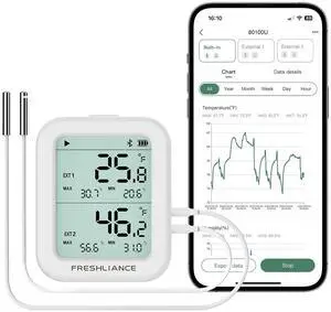 Freshliance Temperature Humidity Data Logger Recorder Bluetooth with 2pcs External Probe, Digital Refrigerator Thermometer Hygrometer, Remote Data Recording Analysis Alarm by Smart APP,BlueTag TH30R-I