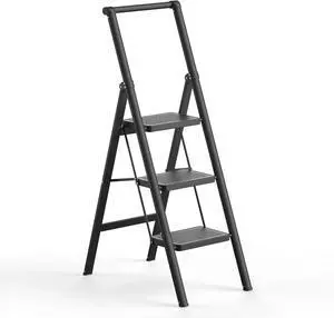 3 Step Ladder, Slim Folding Steps Stool with Handrail, Iron Foldable Black Ladder with Anti-Slip Wide Pedal, for Home, Kitchen, Office, Garage Use (300 lbs Capacity)