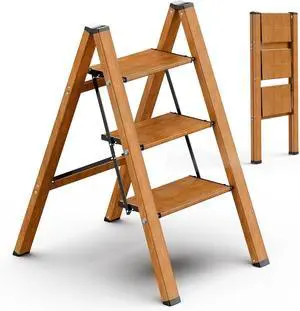 3 Step Ladder, Folding Step Stool with Anti-Slip Wide Sturdy Pedal, Multi-Use for Home and Kitchen Use, Space Saving-Woodgrain(300 lbs Capacity)
