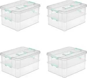Stack and Carry 2 Layer Handle Box, Stackable Plastic Small Storage Container with Latching Lid, Bin to Organize Crafts, Clear, 4-Pack