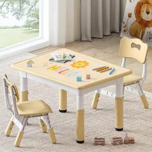 Kids Study Table and Chairs Set, Height Adjustable Toddler Table and Chair Set for Kids Ages 3-8, 31.5" L x 23.6" W Graffiti Desktop Plastic Children Art Table with 2 Seats, Brown