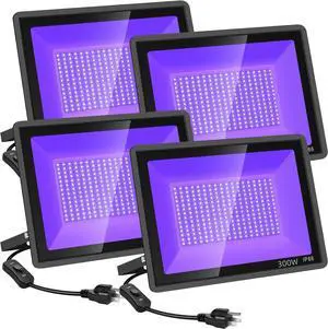 4 Pack 300W LED Black Flood Light, Outdoor with Plug and Switch, IP66 Waterproof Blacklight for Glow Party, Halloween, Fluorescent Poster, Body Paint, Aquarium