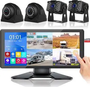 RV Backup Camera for RV Truck Semi Truck Trailer, 4K 10.36" Touch Monitor with Recording DVR MP5 Bluetooth Adjustable Parking Assist Line & Four 1080P AHD IP69 Waterproof Rear Side View Backup Cameras