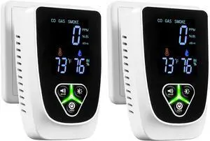 2 Pack 5-in-1 Carbon Monoxide Detectors Plug in, Natural Gas Leak Detector& Smoke Alarm with LCD Display Sound & Light Alert, Portable Fire Alarm with Temperature & Humidity Sensor for Home Travel