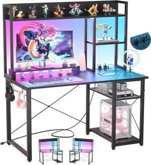 Gaming Desk with Hutch, 39'' Computer Desk with LED Lights & Power Outlets, Home Office Desk with Reversible 5 Tiers Storage Shelves & Monitor Stand, Small Gaming Table for Small Space, Black