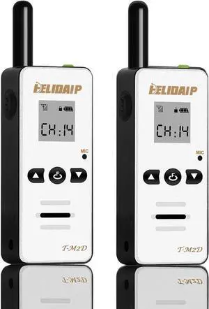 E T-M2D Mini Walkie Talkies 128 Channel, LCD Display, Portable Two Way Radios, PC Programmable, 1100mAh, Ultra Lightweight (50g) for Retail, Hotel, Restaurant, Outdoor, Hiking,White 2 Pack