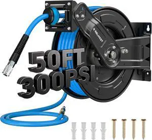 Retractable Air Hose Reel, 50 ft x 3/8 in Hybrid Air Hose Max 300PSI, Heavy Duty Air Compressor Hose Reel with Auto Rewind, Ceiling/Wall Mount for Garage, Workshop, Home Studio