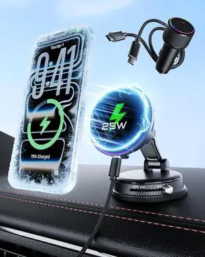 Qi2.2 25W Wireless Car Charger Mount with RGB Light, Magnetic Car Phone Holder with Cooling Fan & 45W Adapter, 360° Rotating Vacuum Suction Mount, Design for MagSafe iPhone 17/16/15/14/13
