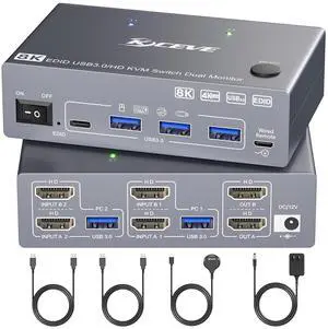 Dual Monitor HDMI KVM Switch 2 Monitors 2 Computers, 4K60Hz and 4 USB 3.0, Control 2 PCs with 2 Monitors and 1 Set of Keyboard Mouse