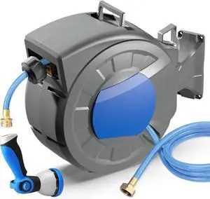 Retractable Garden Hose Reel Wall Mount 1/2" x 100 ft + 6.5 ft Water Hose Reel for Outside with 10 Pattern Nozzle, Automatic Slow Rewind System/Lock Any Length/180°Swivel