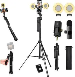 Vlogging Kit for iPhone/Andriod,70.9 Auto Face Tracking Tipod,360 Rotatable Selfie Stick Tripod, Content Creator Essentials, Yutube Starter Kit, Gesture Control w/Remote/Mic/Light