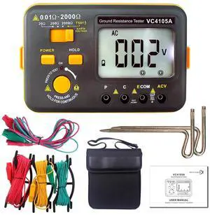 VC4105A Ground Earth Resistance Meter Tester, Grounding Meter Tester for Earthing,Offers Three Resistance Ranges (20/200/2000) and AC Voltages 750V,with Tool Bag