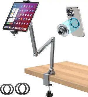 2-in-1 iPad Stand for Desk, Aluminum iPad Holder Arm with Clamp & Magnetic Ring Head, 360° Adjustable Tablet Stand Holder, Bed Clamp Mount for 4.7"-13" iPads Air/Pro/Mini, Galaxy Tab & Phones