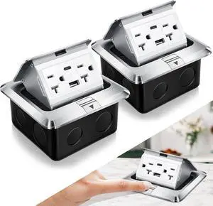 2 Pack Pop up Floor Outlet Floor Kit Waterproof Electrical Outlet Cover Box with 4.8A USB A & Type C Charge and 20 Amp Tamper Resistant Socket Receptacle for Countertop Office Home (Silver)