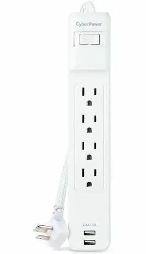 CyberPower CSP604UCW Home Office 6 - Outlet Surge Protector with 1500 J Surge Suppression, Clamping Voltage 800V, 4 ft Cord, NEMA 5-15P, 45 degrees Offset Right, White