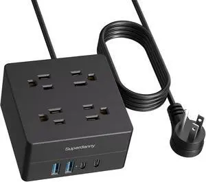 5ft Power Strip, SUPERDANNY Surge Protector 900 Joules, 4-Outlet 4-USB Extension Cord, Overload Switch, Grounded, Mountable, Desktop Charging Station for Home, Office, School, Dorm, Computer, Black