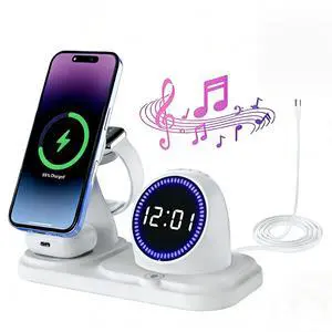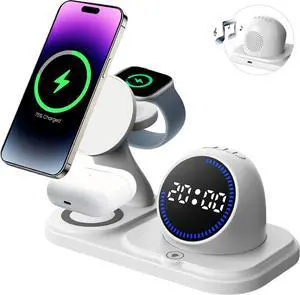 6 in 1 Wireless Charger i-Phone Charging Station: Stand for Multiple Devices for Apples - Compatible i-Phone 17 16 15 14 13 Pro Max Apples Watch Airpods, Design with Wireless Speaker & Clock (White)