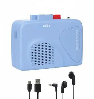 Portable Cassette Player Tape Recorder. Record to Cassettes via Mic or Aux in. Built-in Speaker to Listen to Cassettes. Includes External Mic, Aux in Cable and AC Adapter