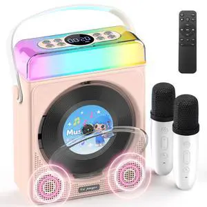 Portable Bluetooth CD Player with Dual Karaoke Microphones & LED Lights, 4000mAh Rechargeable CD Player with Speakers, USB/TF/AUX Music Player, Kids Karaoke Machine for Home, Outdoor, Parties (Pink)