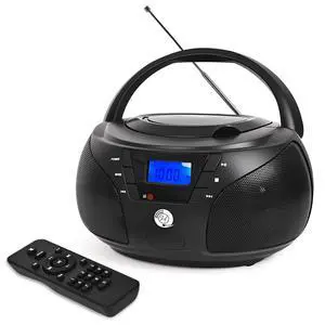 Portable CD Player Boombox with FM Radio, Bluetooth, USB Port, AUX Input, and Headphone Jack  CD-R/CD-RW/MP3-CD Compatible, Clear Stereo Sound, Backlit LCD Display  Black